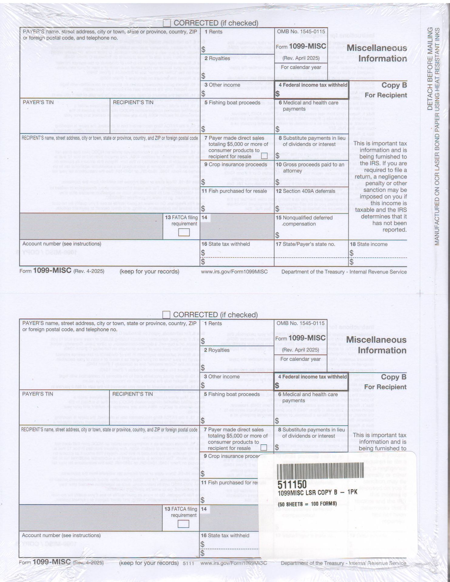 1 Unit = 100 Forms (50 Sheets 2-Up)