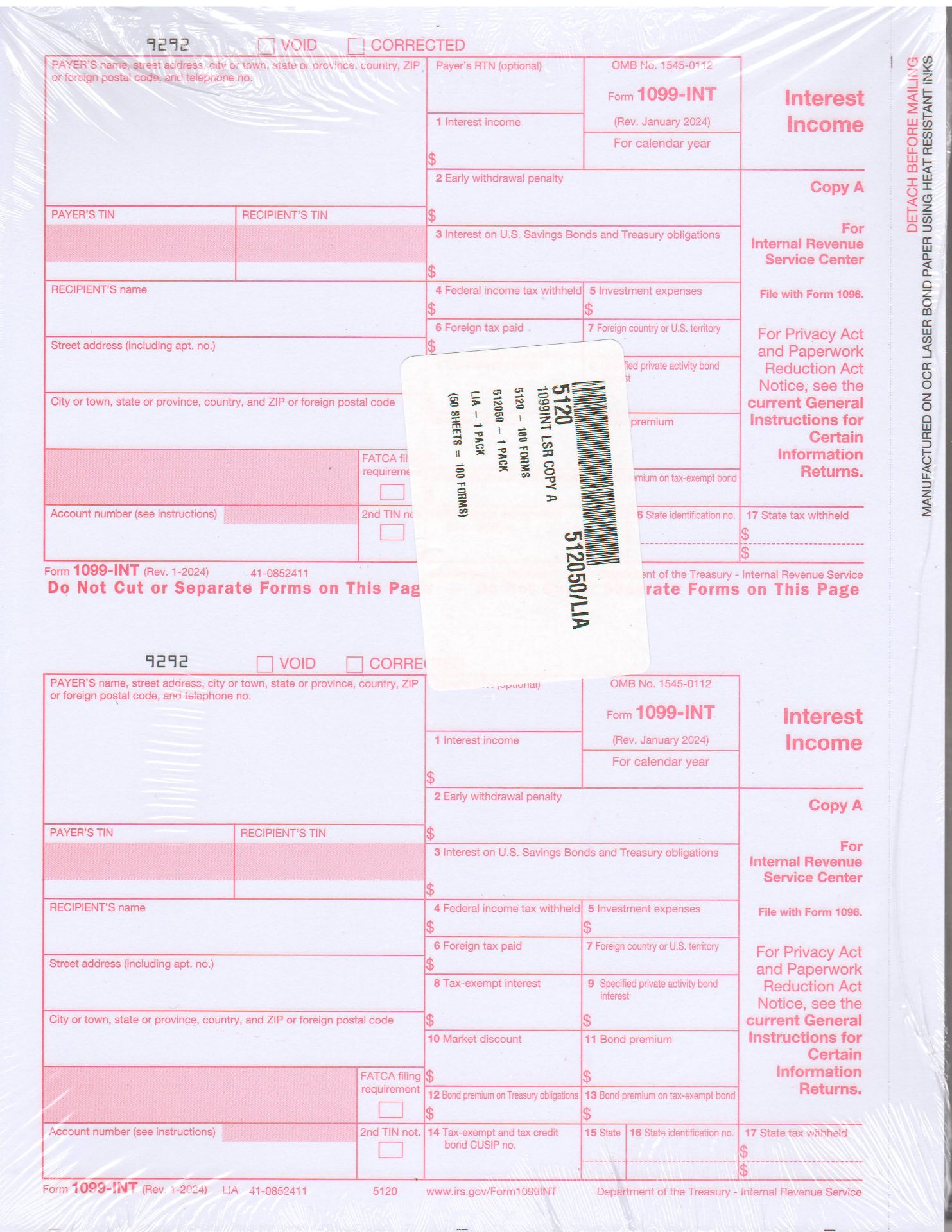 1 Unit = 100 Forms (50 Sheets 2-Up)