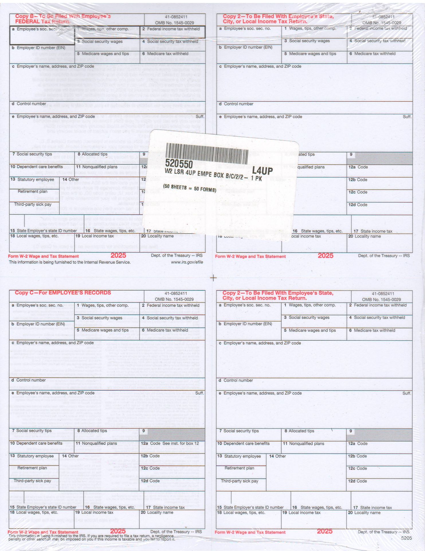 5205 | W-2 Employee Copy B, C, 2 and 2 or Extra Copy - One Sheet per Employee